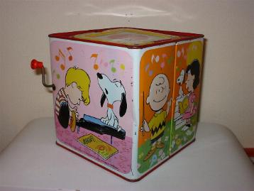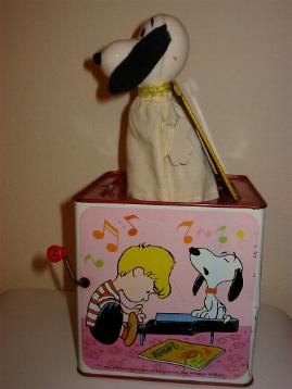 | SNOOPY MUSIC BOX / 1972 U.F.S スヌーピーのビックリ箱です。ハンドルを回すと音楽が流れてそれが終わるとスヌーピーが飛び出します。箱はメタル製、スヌーピーはプラスチック製です。 |