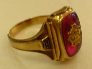 | ビンテージUSAカレッジリング / 10K / 50年代 1955年 10金メイドのビンテージカレッジリングです。55年卒業の記念リングでワインカラー石にゴールドのカレッジマークアクセント。両サイドに'19' と '55' の年号が入っていて、リング内側に "MJ 10K" の刻印。 |