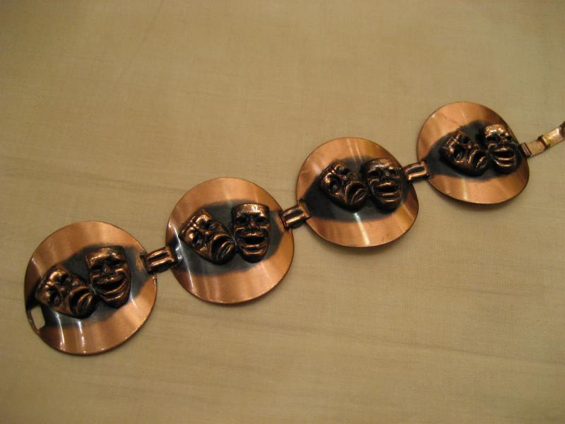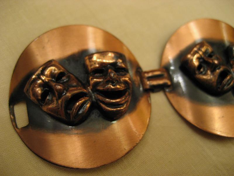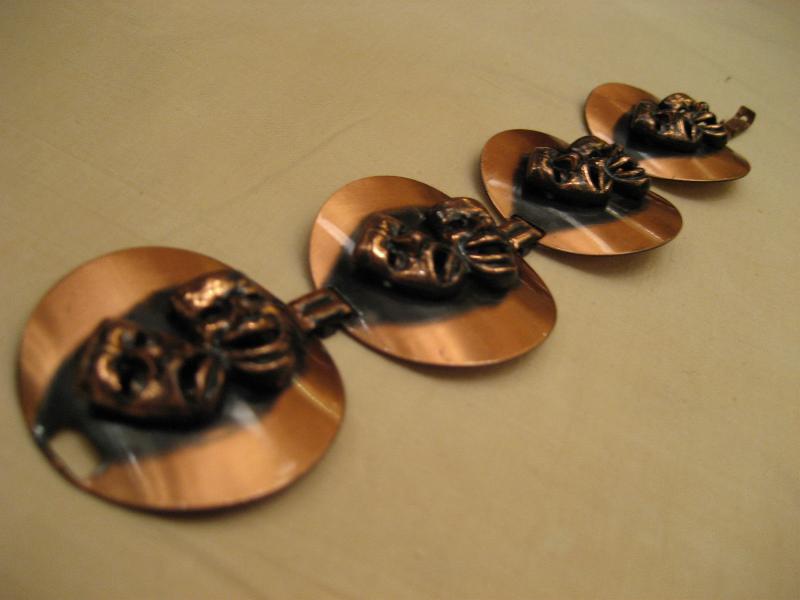 | ビンテージツーフェイスブレスレット / 50-60年代 銅メイドのツーフェイスブレスです。円形パネルに泣き笑いのデコレーションで4連タイプ。クールでキュートなブレスピース! |