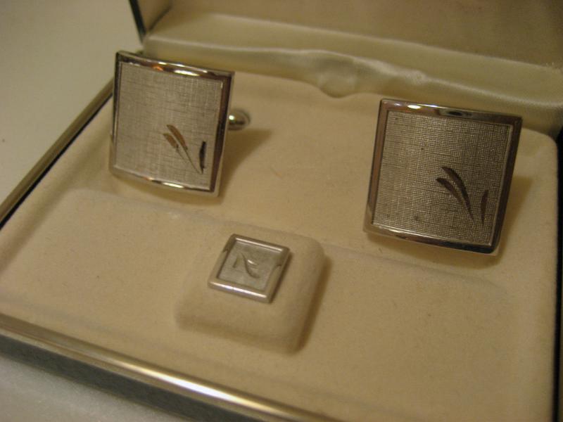 USED スクエアシェイプのカフスボタンとタイタックセット。シルバーカラーでリーフ柄アクセント。オリジナルケース入り。シンプルでスタイリッシュ。クールでGOODなビンテージアクセサリーピース! |
