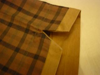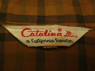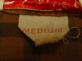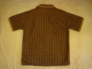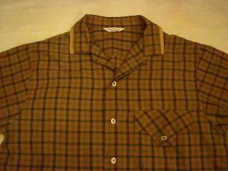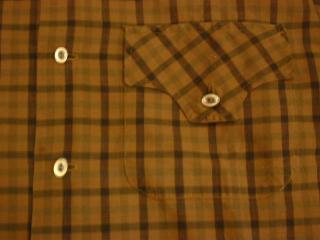 | ビンテージシャツ / 60年代 / USED / MADE IN USA. カリフォルニアメイドのビンテージシャツ。ブラウンベースにこげ茶とカーキのチェック柄でカラシ色のアクセント。衿はオープンカラー、袖口と衿まわりは無地切り替え。胸ポケットのフラップデザインと袖口V字スリット、楕円形のボタンが特徴。 |