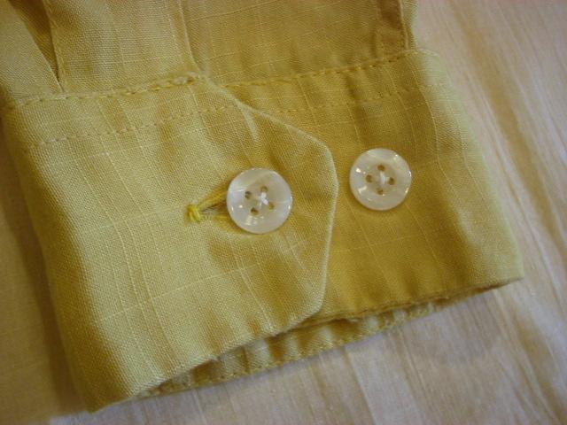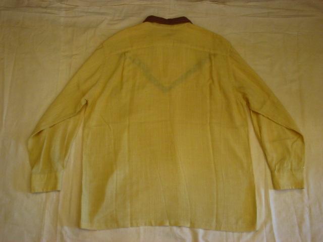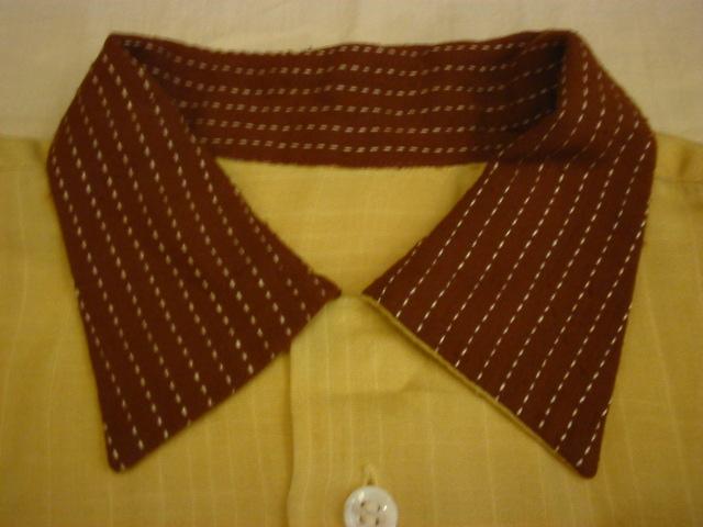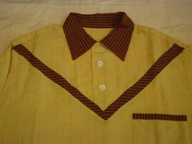 | ビンテージシャツ / 50年代 / USED ツートーン切り替えプルオーバータイプのビンテージシャツ。イエローベースでブラウンにホワイトハンドステッチ柄の生地で衿とポケット口・フロントV字切り替えのクールアクセント!衿元ループ止め、胸ポケットは片胸1個のパッチタイプ、カフスにアジャストボタン付き。 |