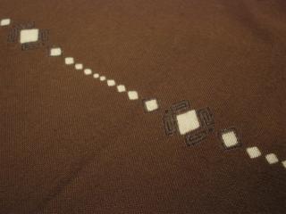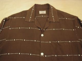 | ビンテージシャツ / 50年代 / USED / MADE IN USA. ロングスリーブのビンテージギャバシャツ。ブラウンベースにホワイトダイヤ柄ボーダー。衿はオープンカラー、胸ポケットはパッチタイプ1個、ダブルステッチ。 |
