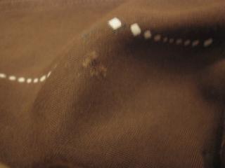 | 特に目立つような大きなダメージはありませんが、若干のシミ、衿元ループが外れてしまっているのと、ポケット端と両袖に小キズ(写真右上参照)があります。それら以外は全体的に良いコンディションです。 | |