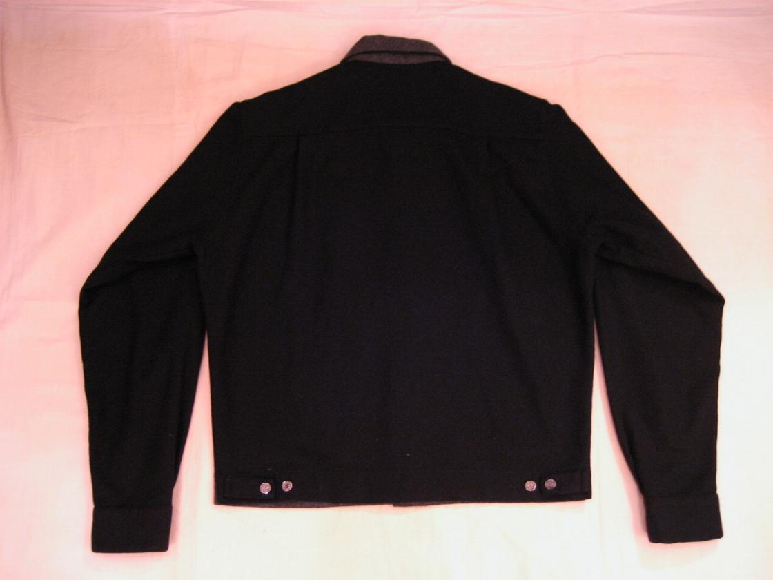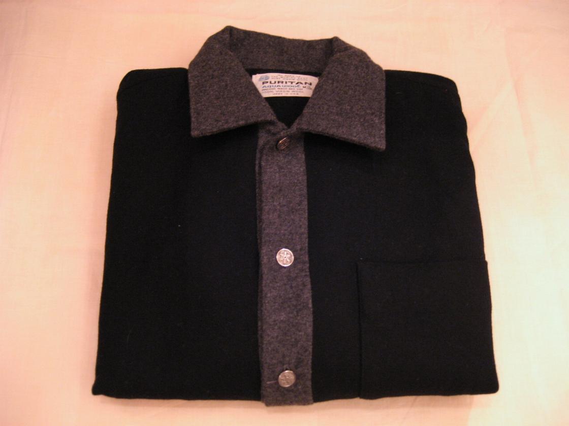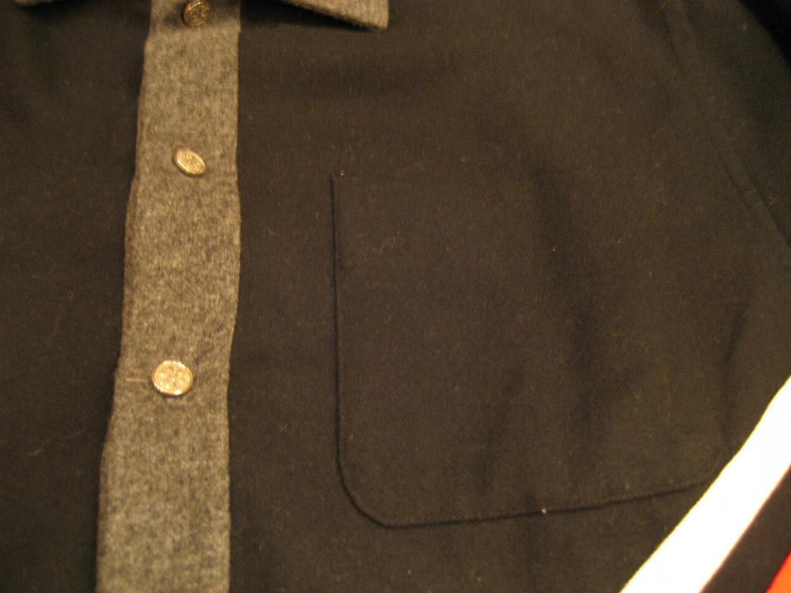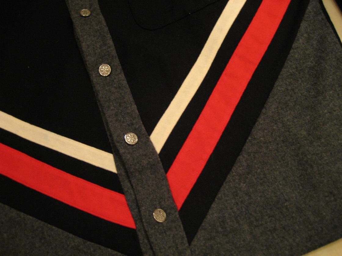| ビンテージシャツジャケット / 50-60年代 / USED / PURITAN, MADE IN USA. 黒グレーのツートーンベースにレッドとホワイトのV字アクセントがクールなシャツジャケです。ボタンフロント、左胸パッチポケット、袖口アジャストボタン、脇裾にアジャストタブ付き。ボタンはメタルタイプで表面にスノーフレークデザイン。 |