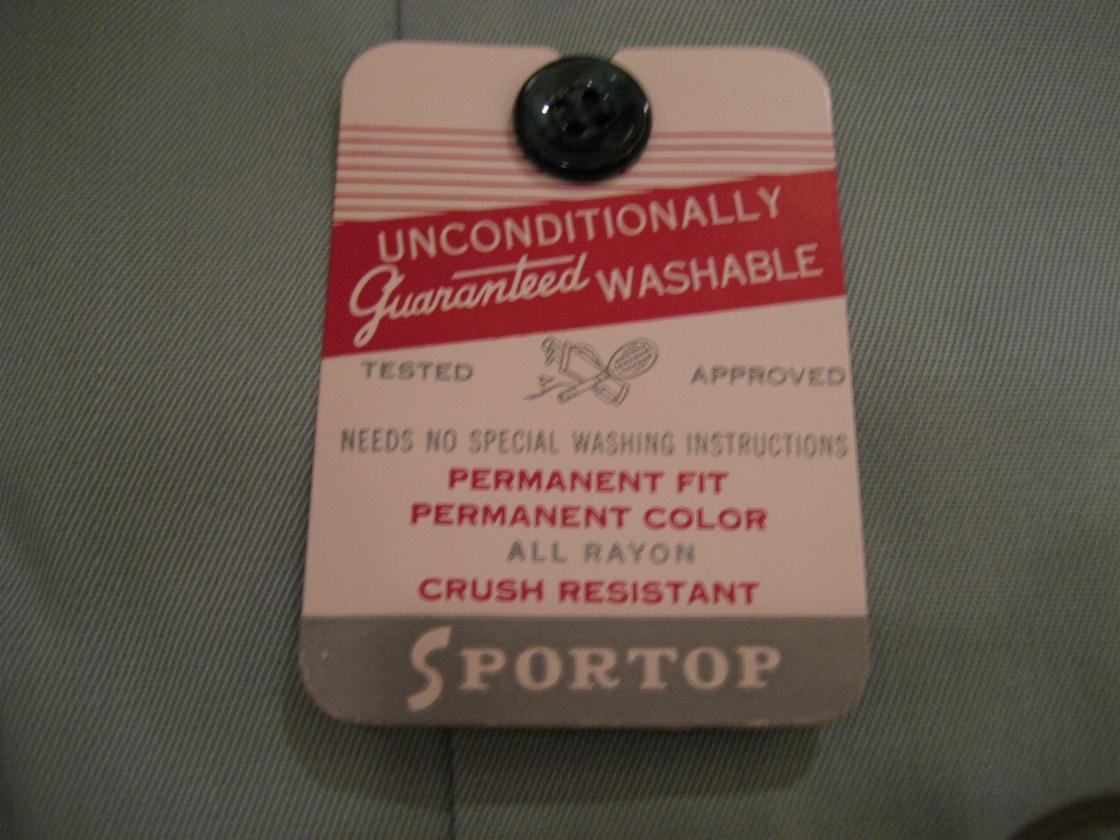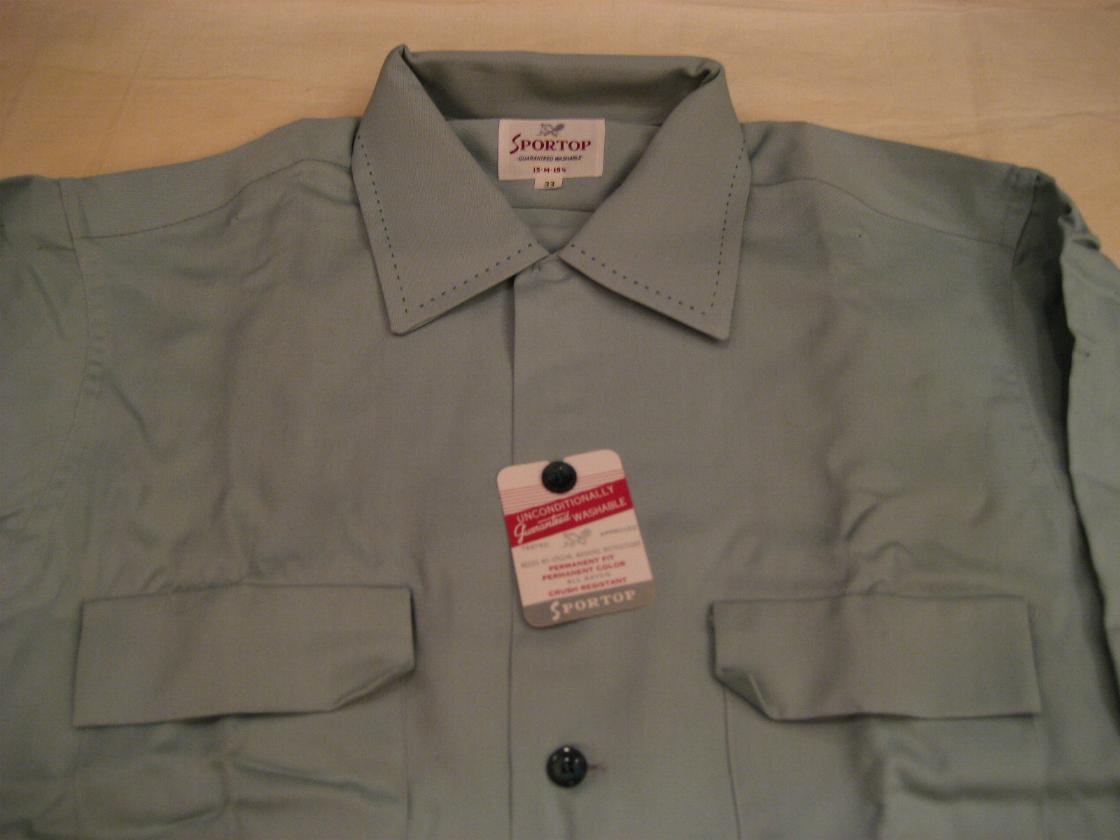 | ビンテージシャツ / 50年代 / SPORTOP, MADE IN USA. デッドストック デッドストックのロングスリーブレーヨンギャバシャツです。衿はオープンカラーでハンドステッチアクセント。衿元はループ止めタイプ。ボタンフロント、ポケットは両胸にパッチ&フラップタイプ。ダブルステッチ。 |