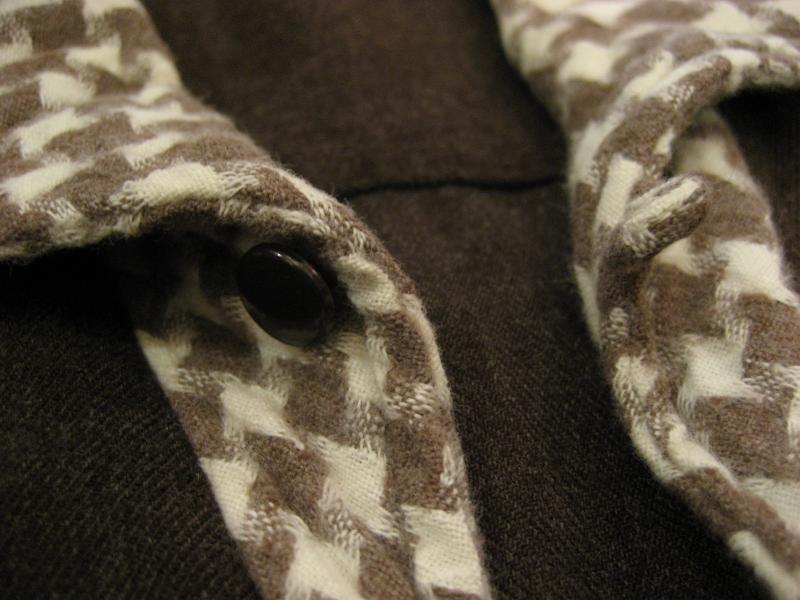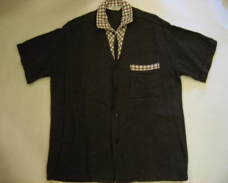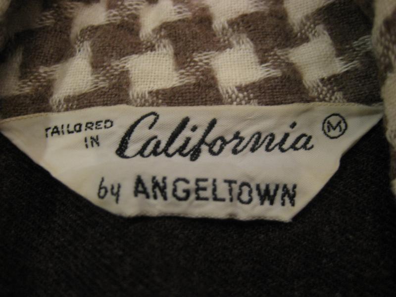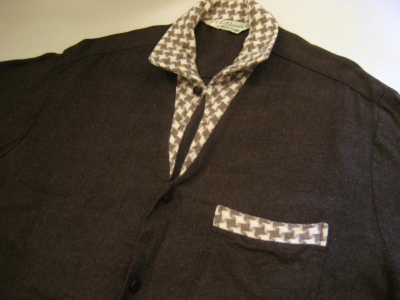 | ビンテージシャツ / 60年代 USA "California by ANGELTOWN" USED ダークブラウンボディに衿とポケット口がハウンドツース(千鳥格子)アクセント切り替えのビンテージショートスリーブシャツ。イタリアンカラータイプのオープンカラーでボタンは糸穴のない足付きタイプ。 |